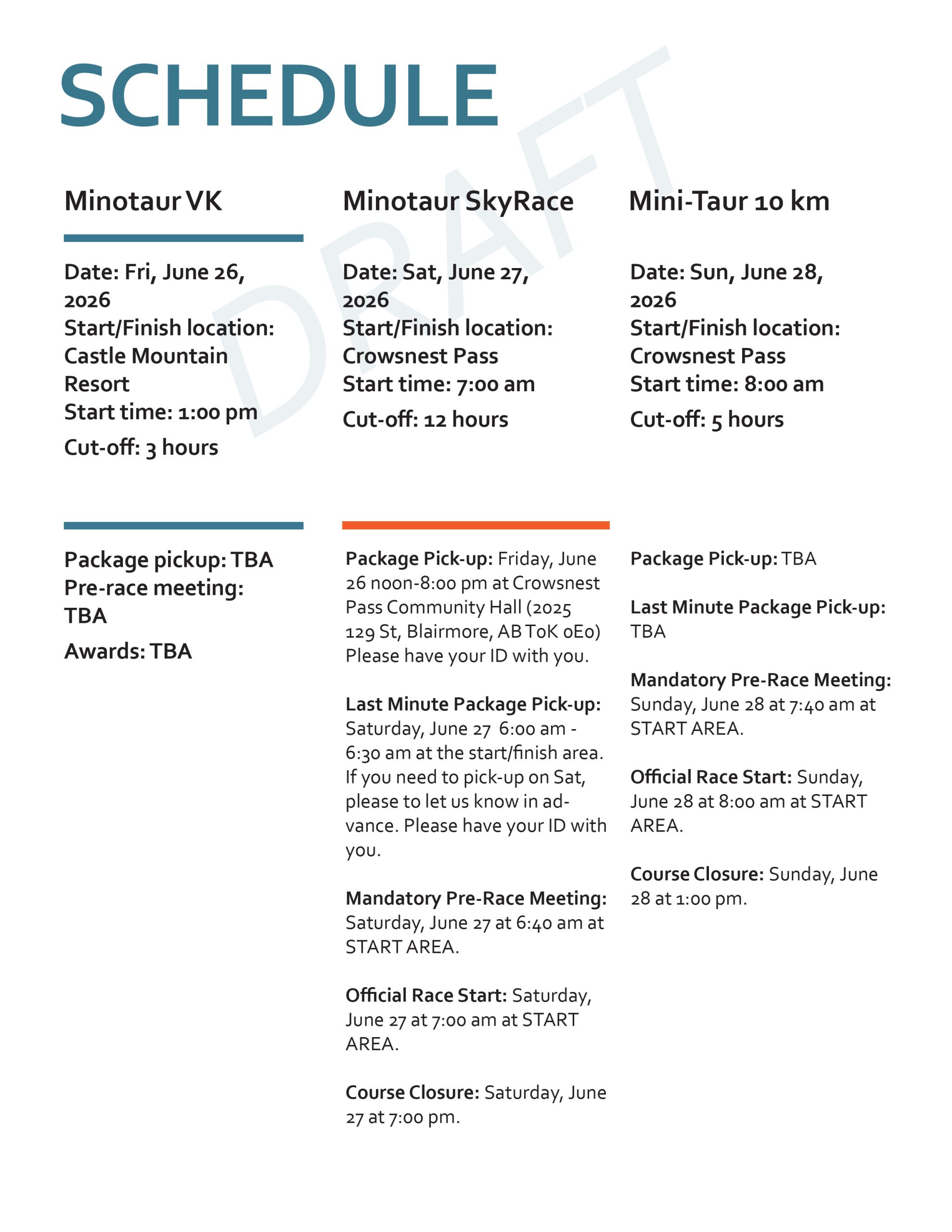 If you have a medical condition, allergies, or medications, that you wish for our medical personnel to know about, then please have the voluntary medical form ready as well. This is confidential and will be destroyed after the race.